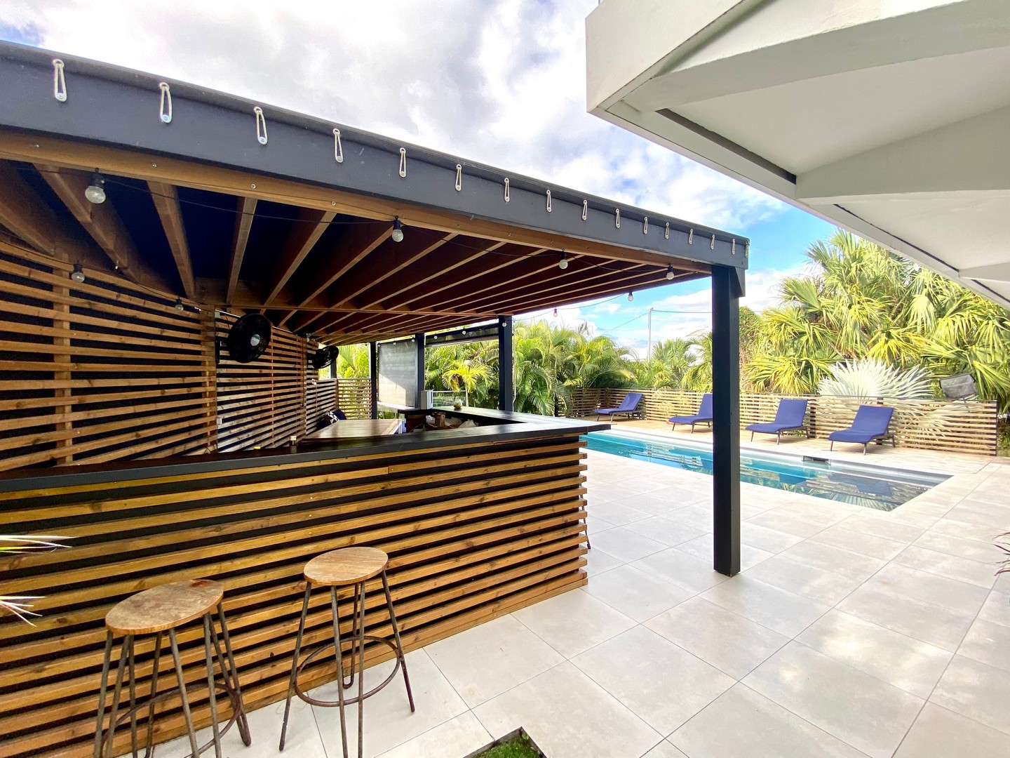 A large arbor shelters a second fitted kitchen, a second ding corner and a bed to relax by the pool.