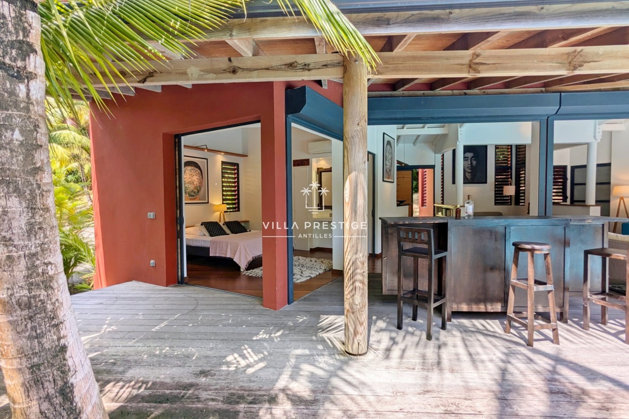 La cuisine moderne, parfaitement équipée, s’intègre avec élégance à l’espace de vie. Sous le carbet, la grande table extérieure devient le lieu privilégié pour partager des repas conviviaux, face aux palmiers et à la piscine.